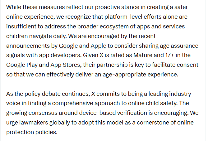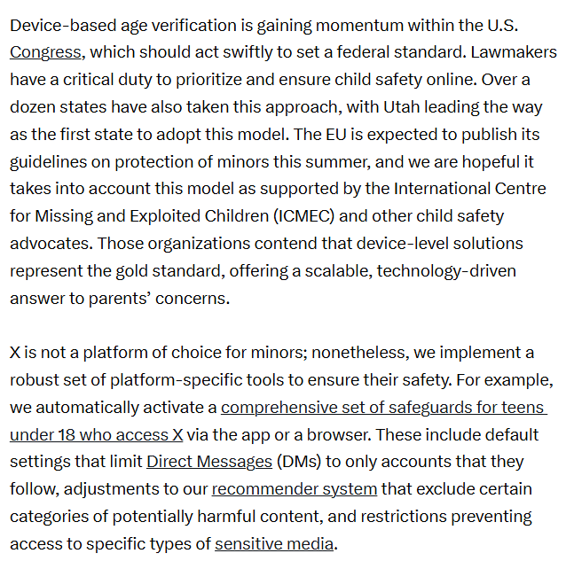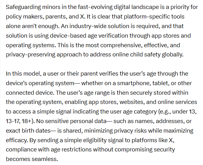There has been this growing effort to force social media, sites and platforms to require age verification. Florida has just passed such law (https://reclaimthenet.org/florida-gives-tech-platforms-deadline-for-age-id-checks). Florida could go bankrupt suing company after company as new social media platforms are born everyday. This is why I keep on referring to what X has been advocating: device-based age verification ( https://x.com/GlobalAffairs/status/1905297118534754707 ). Since so many are worried about clicking on links, or too lazy to do so, I have other problems, I post the text here.