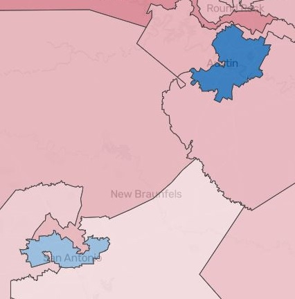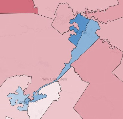 Here are what the maps look like (taken from link above). Currently, San Antonio and Austin have a Congressional district covering both cities: