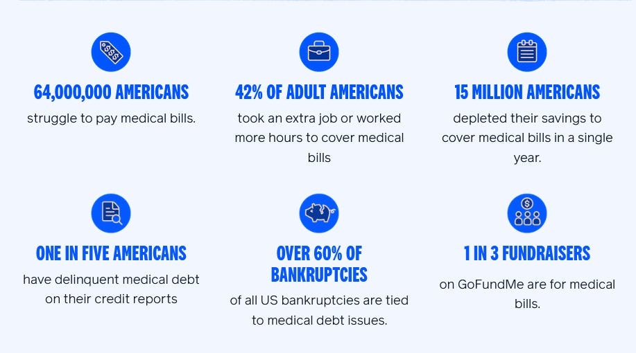 However, this organization, Undue Medical Debt (https://unduemedicaldebt.org/) is doing something grand. They help buy the debt and pay it off. Sounds complicated, but it is simple by financing the debt away. Anyone can donate and help out.